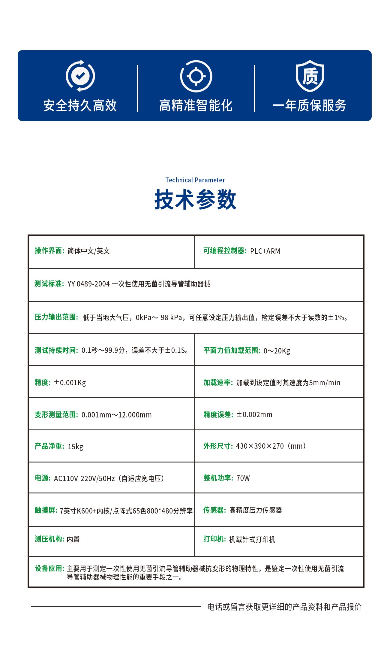 18luck电竞官方下载科技XB0489-C引流系统组件抗变形测试仪主要用于测定一次性使用无菌引流导管辅助器械抗变形的物理特性,是鉴定一次性使用无菌引流导管辅助器械物理性能的重要手段之一。采用可编程控制器,触摸屏,压力传感器,加压装置,机载打印机等组成。产品规格、测试压力值设定、保持时间设定,打印设定、测试、加压、减压、时间、标定,检定等。机载打印测试数据。实时显示测试加压值,保持时间等数据。