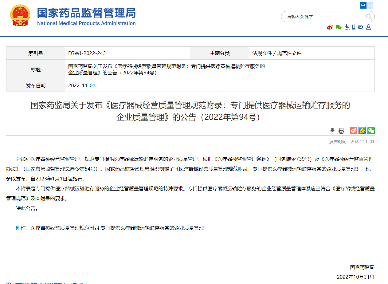 国家药监局关于发布《医疗器械经营质量管理规范附录:专门提供医疗器械运输贮存服务的 企业质量管理》的公告(2022年第94号)